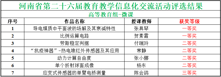 张具琴老师的《导电媒质中平面波的场解及其衰减特性》、贺素霞老师的《比例运算电路》荣获一等奖;付瑞玲老师的《劳斯稳定判据》、常静老师的《“抗疫神器”——热电堆红外传感器及其应用》、张小娜老师的《动力计算自由度》、杨东老师的《单个折射球面成像》荣获二等奖;陈会鸽老师的《应变式传感器的单臂电桥测量》荣获三等奖。