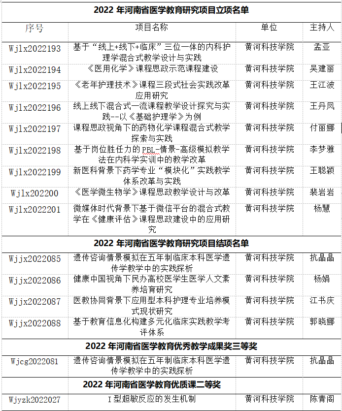 近日,河南省卫生健康委公布2022年河南省医学教育研究项目立项教学成果和优质课评选结果(豫卫科教函[2022]34号),医学院获批河南省医学教育研究项目立项9项,结项4项,获评河南省医学教育优秀教学成果奖三等奖1项,获评河南省医学教育优质课二等奖1项。
