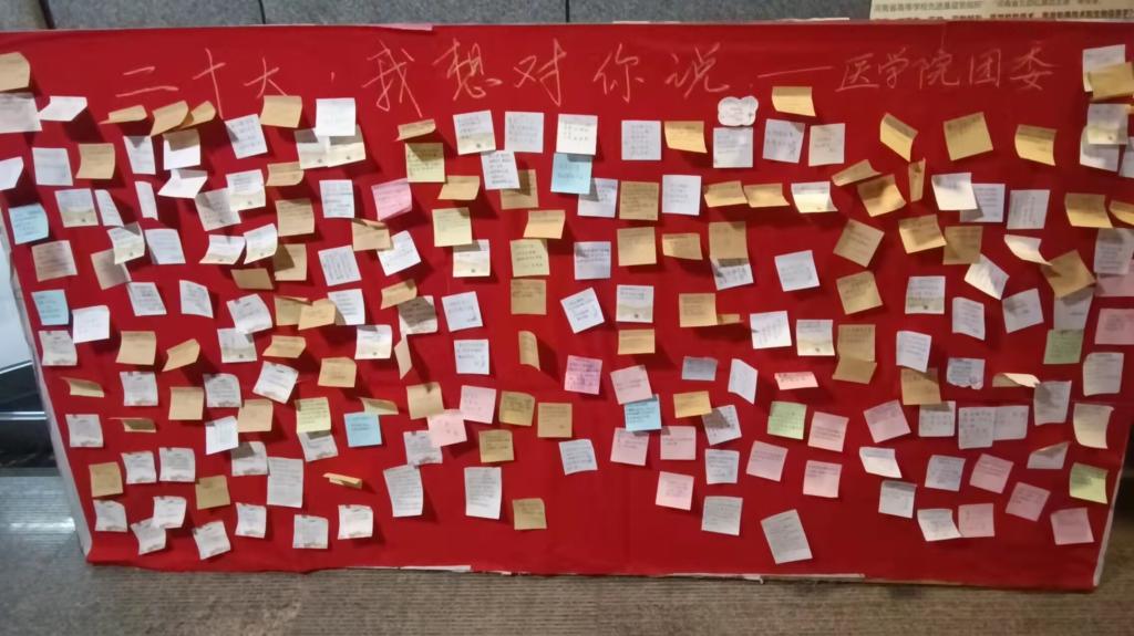 百年征程,落笔青春,医学院楼前绚丽多彩的便利贴、铿锵有力的字迹、真诚的祝福,无不表达了同学们内心对党的热爱以及听党话、跟党走的决心。