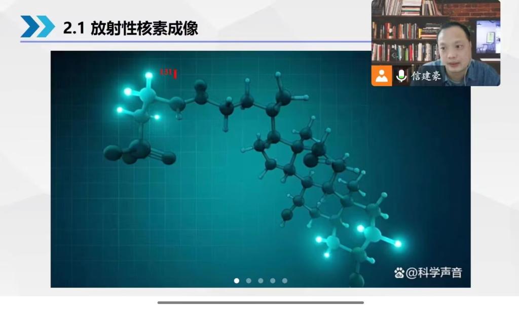 信建豪主要介绍了理化检验和影像学检验中的点击化学与化学成像。主要内容分为两类,第一部分是理化检验方面的ELISA、点击化学、分子印迹、模拟酶。第二部分是影像学检验方面的放射性核素成像、荧光成像、化学发光成像。信建豪通过简明易懂的语言以及生动形象的图画,向学生讲解了这些偏向于专业性有些难以理解的内容,便于学生理解。