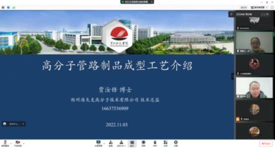 贾汝锋博士介绍了公司的基本情况及公司的产品。他从市场需求、技术要求、产品设计、产品检测等方面介绍了聚四氟乙烯特种管路的开发历程,让学生们明白了一款产品从研发到应用的过程。他认为学生缺乏理论学习兴趣的原因是缺乏对产品生产过程的了解,因此,他专门给大家上了一堂关于高分子管路的生产工艺见习实习的“线上课”。他针对生活中常见的管路进行分类,结合生产视频讲述了管路的生产过程,让同学们“身临其境”的去认识管路的生产工艺。同时,他结合生产过程中用到理论知识,逐一给大家分解,让学生深刻体会到了课堂所学习的知识真正的可以用到实际生产中,激发了学生们的学习兴趣。最后,贾汝锋博士总介绍了高分子特种管路的发展方向,为学生的科研以及如何选择竞赛项目提供了方向。