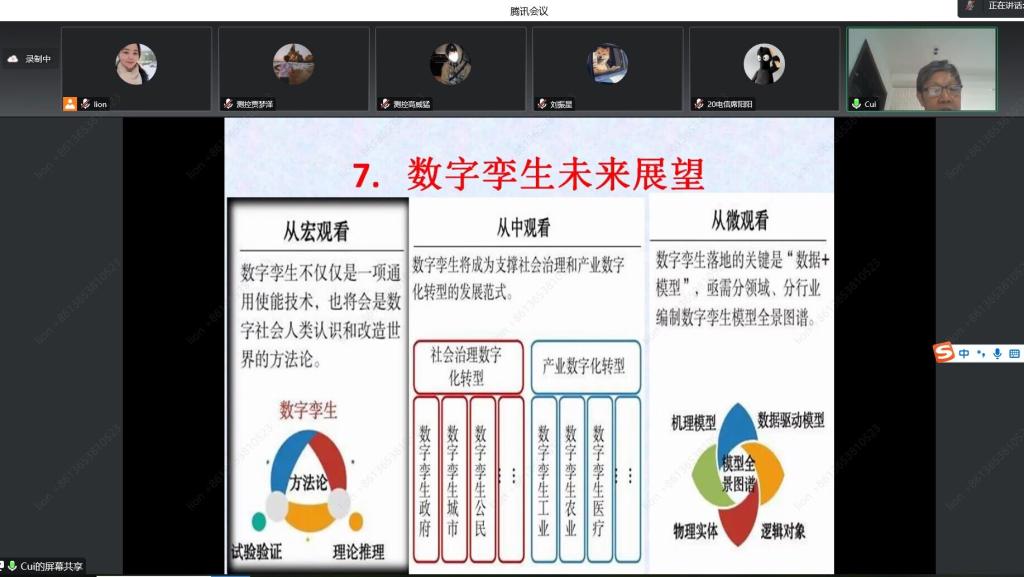 崔光照教授的报告主要涉及人工智能中数字孪生技术的相关内容。崔教授主要从数字孪生技术的概念、数字孪生技术的发展沿革、数字孪生的技术内涵、数字孪生技术的架构、数字孪生技术的应用场景、数字孪生DT的相关讨论、数字孪生未来发展等几个方面的进行了讲解。崔光照说,数字孪生技术主要是利用物理模型、传感器更新、运行历史等数据,集成多学科、多物理量、多尺度、多概率的仿真过程,在虚拟空间中完成映射,反映相对应的实体装备的全生命周期过程,简单来说,就是一个在设备或系统的基础之上,创造一个数字版的“克隆体”。他以西门子、美的、达索、GE等企业对数字孪生技术的应用为切入点,给同学们逐步展开讲解了数字孪生技术在智能制造、智慧航天、智慧城市、智慧社区、智慧医疗等领域的应用,介绍了实现数字孪生的“四大核心技术群”,并且从“设想-方案确定-试运行-产业化-效果评价”部署的视角介绍数字孪生的应用价值,让同学们受益匪浅。
