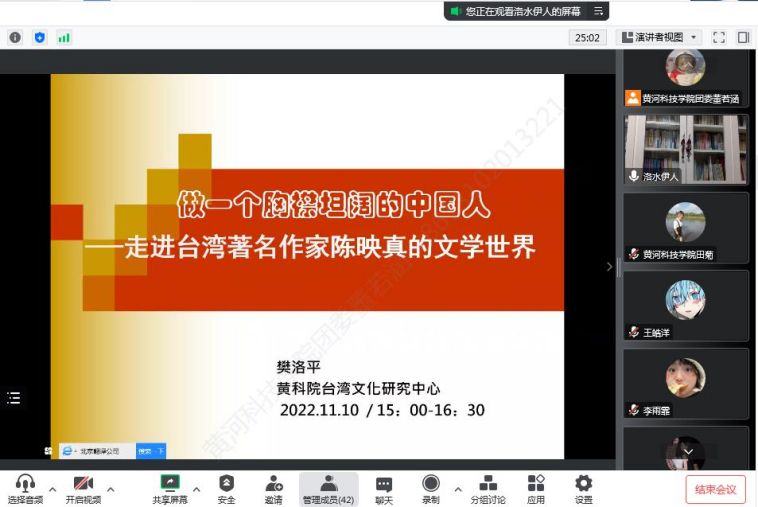 为充分发挥校园文化,服务学生成长成才的重要作用,推动第二课堂与第一课堂的深度融合,提升学生的学术研究和创新能力,打造“比学赶帮超”的优良学风,11月10日365官网邀请郑州大学文学院二级教授、beat365唯一官网台湾文化研究中心主任樊洛平做主题为“做一个胸襟坦阔的中国人一一走进台湾著名作家陈映真的文学世界”的学术讲座。此次讲座采用线上方式进行,校团委副书记田菊及二百余名同学参加。
