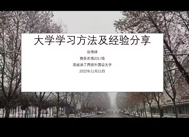 陈恒祥目前在西安外国语大学翻译专业攻读研究生,11月14日,他线上为在校生作大学学习方法与经验分享交流,学院200余名同学聆听。陈恒祥认为,当前学习资源很丰富,有许多英语学习APP和视频网站,大家缺少的不是资源而是思考如何使用资源。他鼓励同学们树立长远目标,而备考证书和竞赛就是学习过程中阶段性的里程碑。只要把阶段性目标都实现了,长远目标也指日可待。陈恒祥还与同学们互动,回答了大家们在听力、口语、写作和翻译方面的问题。他希望所有同学能够坚定梦想,并能通过努力遇见更好的自己。