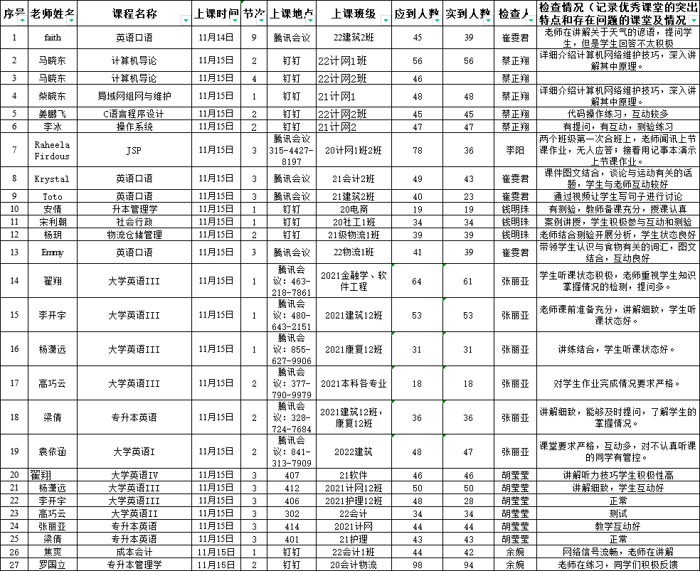 国际学院分组分专业制定听查课执行方案,各组查课要覆盖到每一个课堂,尤其关注下午后两节及晚上的课堂状态。做好线上授课的师生沟通交流,把工作安排、实施方案和要求提前发到相关群内,做好线上教学组织。并充分利用学生信息员做好线上课期间教学信息汇报、反馈和通报工作。
