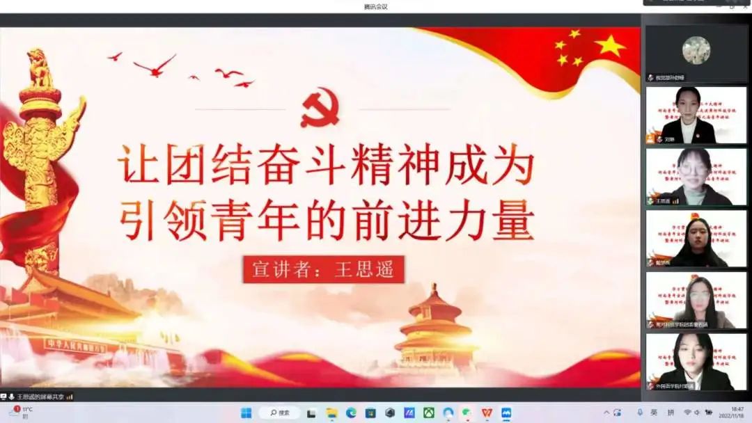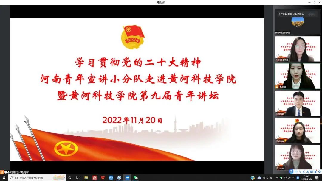 11月20日,学习贯彻党的二十大精神河南青年宣讲小分队走进beat365唯一官网暨beat365唯一官网第九届青年讲坛第二场活动在腾讯会议上举行,河南省示范青年宣讲小分队成员戴梦瑶、王思遥、付路通、郝伟、郭家豪作宣讲,校团委书记翟利强、校团委副书记董若涵和200多名艺体学部和医学院学生参加宣讲会。