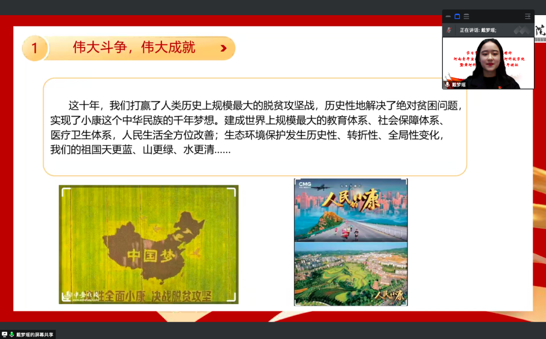 戴梦瑶以《以文艺之光,守青春使命》为宣讲题目,结合近年来的优秀文艺作品,讲述了艺术的创新和发展,她指出,“实现第二个百年奋斗目标的新征程已经开启,文艺工作者正和全国人民一道,并肩作战,共同奋斗。让我们凝聚力量,行动起来,修身守正,立心铸魂,在祖国的大地上传承优秀的文化,在时代的大潮中实现艺术的创新,做有信仰、有情怀、有担当的新时代文艺工作者。”