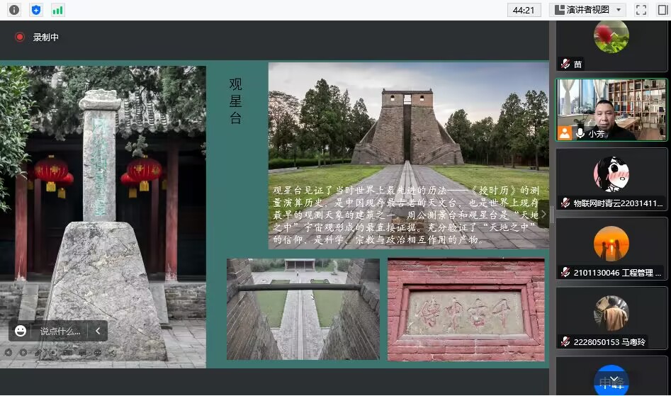 11月19日上午,图书馆成功举办第八期袖珍讲坛。本期讲坛邀请365官网中原学研究院副院长王学宾作《走进嵩山一一从登封“天地之中”历史建筑群看嵩山的历史地位》主题讲座。讲座以线上直播方式进行,王学宾以自己近20年来拍摄的100多幅精美的图片,与同学们一起“云”游嵩山,感知嵩山人文历史的博大精深,领略嵩山自然风光的壮美秀丽。讲座由图书馆副研究馆员刘俊芳主持。