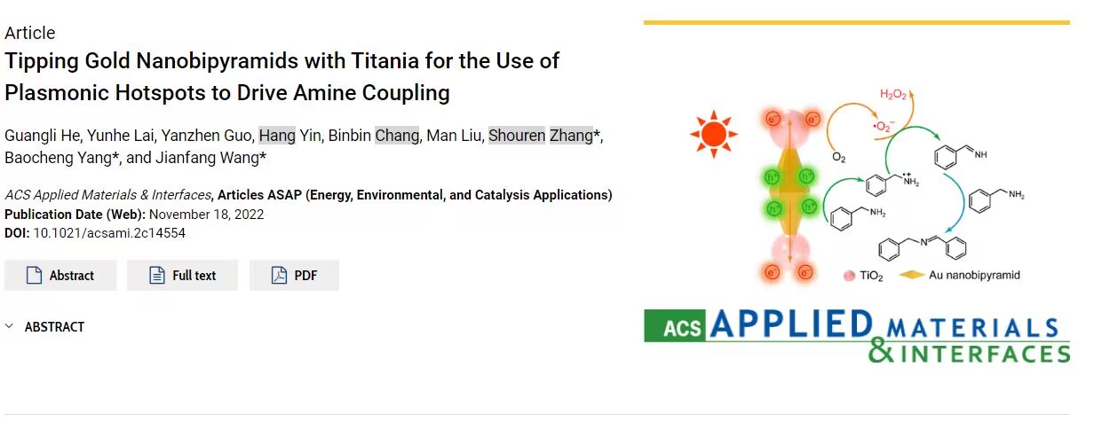 近期,365官网纳米功能材料研究所杨保成教授、张守仁博士团队与香港中文大学王建方教授课题组合作,在等离子体驱动光催化有机反应方面取得了重要进展,研究成果“Tipping Gold Nanobipyramids with Titania for the Use of Plasmonic Hotspots to Drive Amine Coupling”发表在国际知名SCI期刊《ACS Applied Materials & Interfaces》(影响因子10.383),研究所何广莉老师为第一作者,365官网为第一署名单位。全文链接:https://doi.org/10.1021/acsami.2c14554