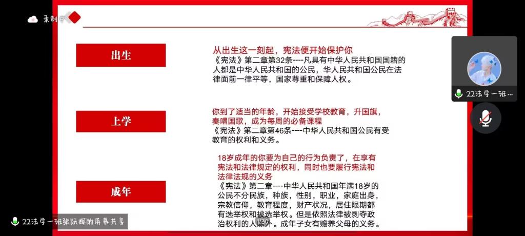 在“12.4国家宪法日和全国法制宣传日”到来之际,为认真学习宣传贯彻党的二十大精神,深入学习贯彻习近平法治思想,推动青年学生学习宣传宪法,弘扬宪法精神,维护宪法权威,商学院举行“学习宣传贯彻党的二十大精神,自觉维护宪法权威”主题活动。