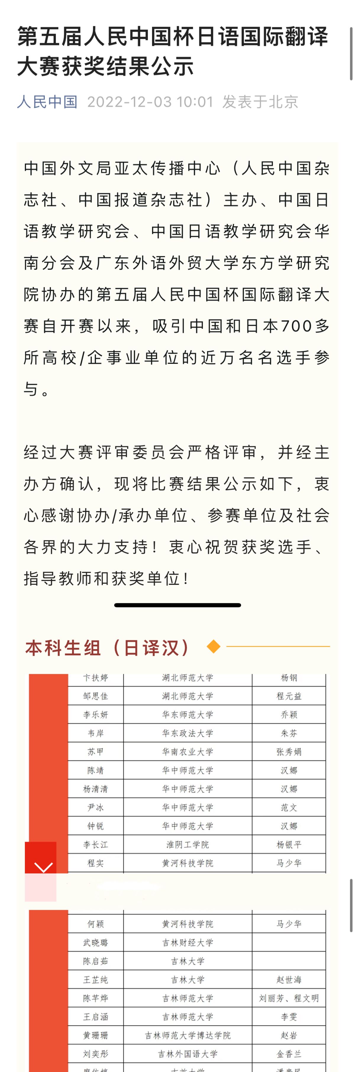 人民中国杯日语国际翻译大赛属于国际性赛事,由中国外文局亚太传播中心(人民中国杂志社、中国报道杂志社)主办、中国日语教学研究会、中国日语教学研究会华南分会和广东外语外贸大学东方学研究院协办。本次比赛自2022年2月开赛以来,历经8个月,吸引了来自中国和日本700多所高校、企事业单位的近万名选手参赛。通过比赛,参赛学生锻炼了翻译能力,增强了专业学习动力,同时对自己的专业知识水平有了更清晰的认知。