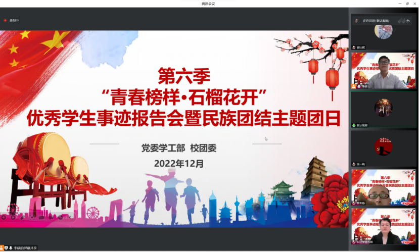 为深入学习贯彻党的二十大精神,引领青年学生铸牢中华民族共同体意识,凝聚青春奋进力量,12月5日——8日,由党委学生工作部、校团委主办的第六季“青春榜样·石榴花开”优秀学生事迹报告会以线上主题团日形式举行,校团委书记翟利强、派驻教师、辅导员,与来自商学院、医学院、国际学院的六个班级团支部共300余名师生参加报告会。