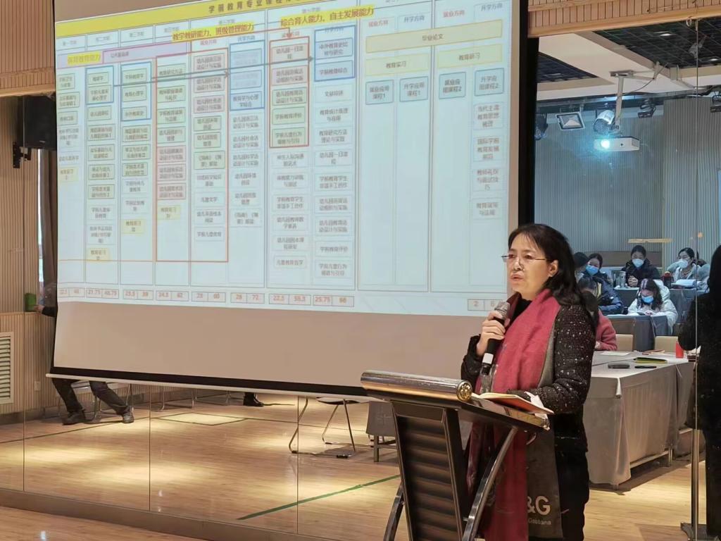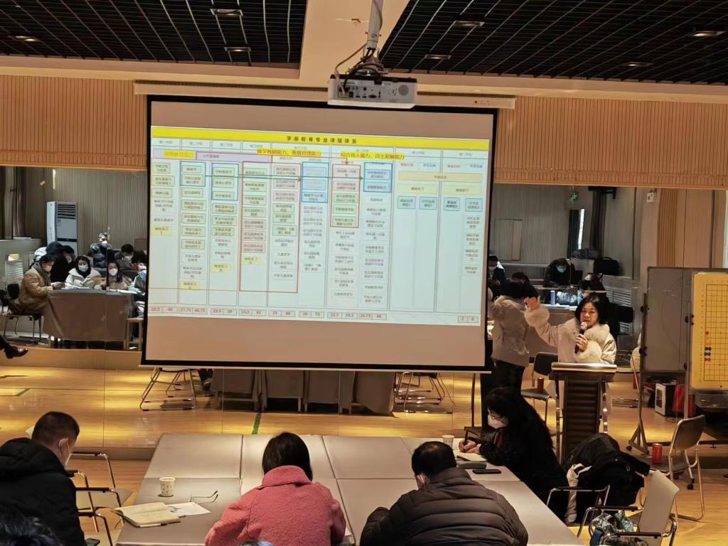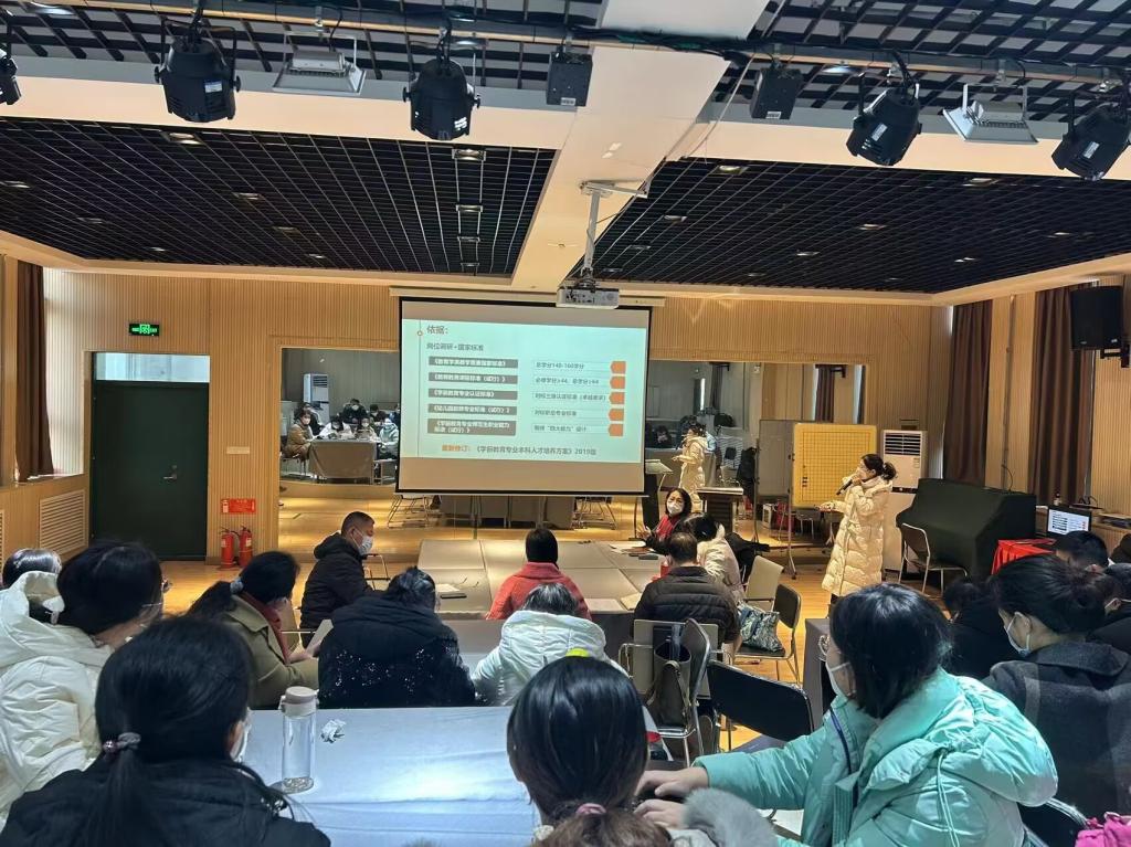 学前教育系宋佳老师对学前教育专业课程体系构建做详细介绍,从课程体系总体情况、课程设置、课程介绍、工作推进等方面分析课程体系建构情况。通过课程体系改革,综合提升学生保育教育能力、教学科研和班级管理能力、综合育人和自主发现能力。随后专职教师对课程体系改革开展分组讨论,各组组长对讨论结果进行汇报。