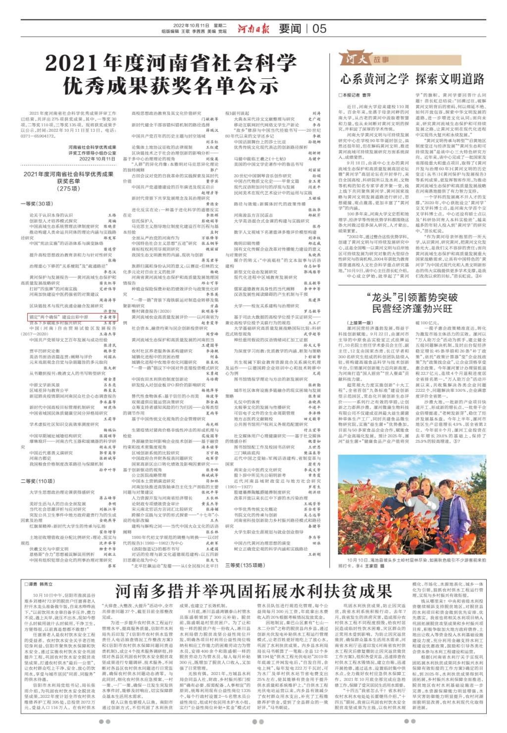 河南省社会科学优秀成果奖是我省目前最高层次的哲学社会科学奖项,用以奖励在哲学社会科学研究领域作出较大贡献、具有较高学术价值或应用价值的研究成果,是衡量高校哲学社会科学发展水平和科研实力的重要标志。此奖励旨在充分调动和发挥广大科学工作者开展哲学社会科学研究的积极性、创造性,促进我省哲学社会科学事业的繁荣发展,更好地服务我省经济社会发展。2021年度河南省社会科学优秀成果共评出275项,其中,一等奖30项,二等奖110项,三等奖135项。