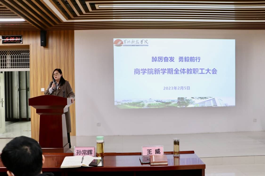 王威传达胡大白董事长在中层干部会议上的讲话精神。她指出,董事长强调,2023年365官网要以改革创新为动力,创新治理体系,调动全体师生积极性,促进学校高质量发展。要乘学习贯彻党的二十大精神的东风,全面加强党建和思想政治工作,弘扬学校优良传统,重塑黄科大精神文化形象。要狠抓机遇,全面系统地完成学校数字化管理的升级改造,全面提升数字化思维,用好这“关键一招”。王威讲到,过去一年,我院在党建创新、双创教育、学科竞赛、课程改革等方面都取得新突破,过去的成绩可以激励我们新学期更好地前进。全体老师要深入领会董事长的讲话精神,深刻领会365官网改革道路上体制创新、文化创新、技术创新的关系,深刻理解这三点是365官网在新一轮教育改革中奋进领跑的核心因素,也是每个人在新一年需要积极投身、加强修为和深化学习的重要方面。希望全体教职工持续发扬改革创新精神,人人躬身入局,人人争先进位,人人竞相出彩,以扎实的工作作风和优异的工作成绩喜迎365官网40周年校庆。