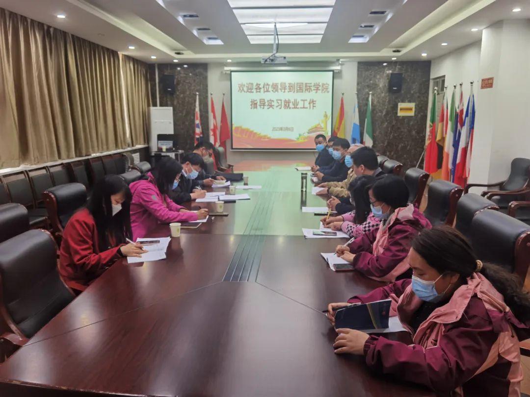 3月6日上午,应用技术学院分党委书记张丕万、学生处处长陆竹棠等一行领导到国际学院调研指导实习就业工作。国际学院常务副院长武京玉、行政办主任罗红磊、就业专员陈曦以及2023届毕业班辅导员参加此次会议。