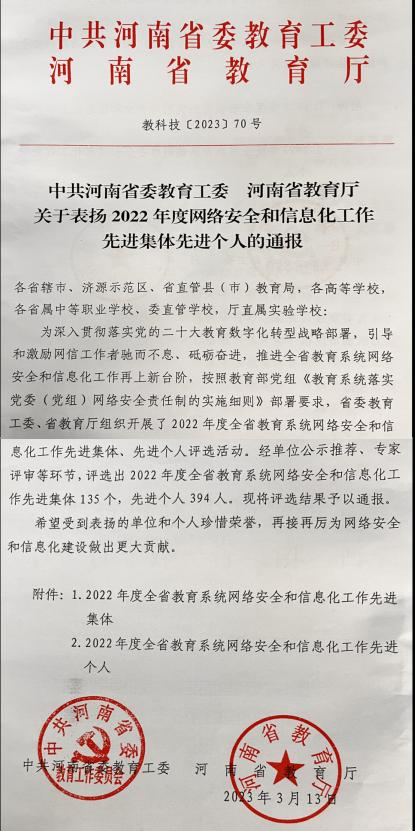 3月17日,全省教育信息化工作会议在郑州市黄河迎宾馆召开。会议宣读中共河南省委教育工委、河南省教育厅下发教科技[2023]70号《关于表扬2022年度络安全和信息化工作先进集体先进个人的通知》,365官网荣获先进集体称号,现代教育技术中心(信息化管理办公室)亢志勇、李筱倩荣获先进个人称号。