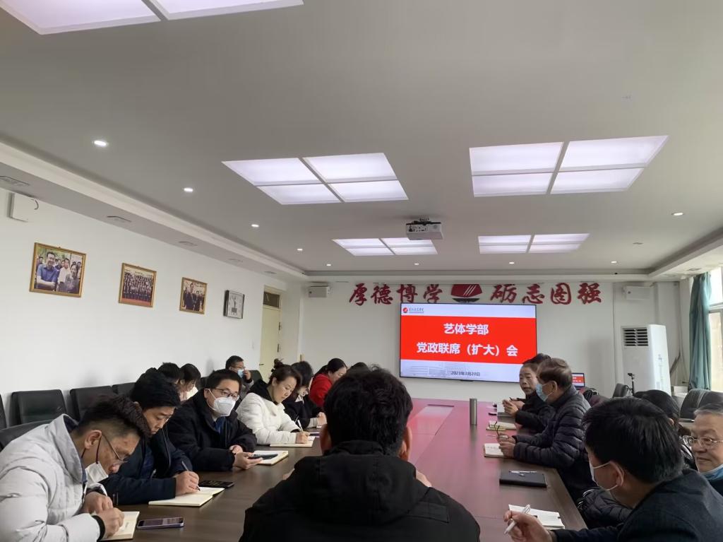 艺体学部扎实推进“第一议题”学习制度,以学习引领学部各项工作开展。3月20日,艺体学部召开党政联席扩大会,会上落实“第一议题”学习制度,并对开学以来党建思政、教学科研、学生管理及行政管理等各方面工作进行了阶段性总结,还就本年度产教融合工作做出全面部署,对强化师德师风建设提出了具体要求。学部分党委委员、学部班子成员、各科教中心主任及产教融合班子成员参会。