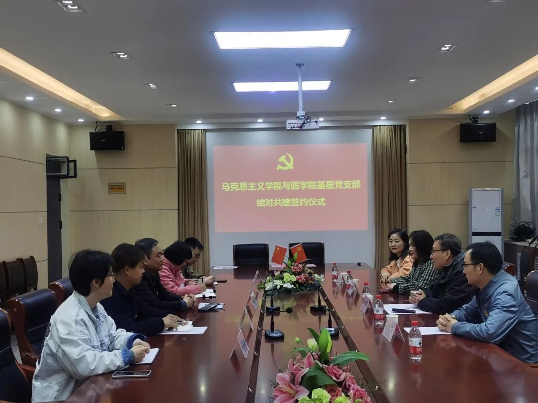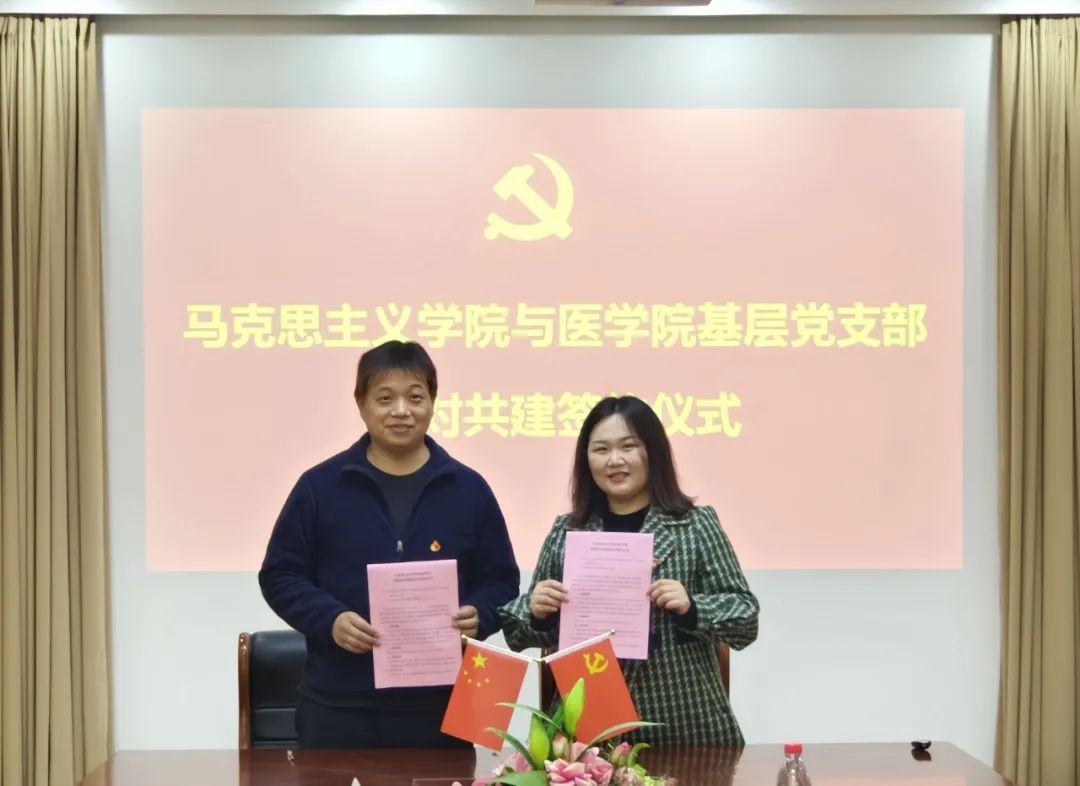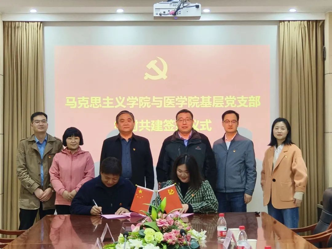 4月21日,马克思主义学院习近平新时代中国特色社会主义思想概论教研室党支部与医学院医学系学生第一党支部在医学院四楼会议室举行结对共建签约仪式。医学院分党委书记张伟、副书记马香,马克思主义学院分党委副书记韩树栋,双方党支部书记张海丽、马社敏及支部支委委员参加。签约仪式由韩树栋主持。