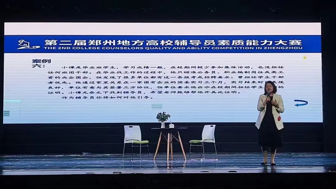 本次比赛由郑州市教育局主办,旨在深入学习贯彻习近平新时代中国特色社会主义思想,全面学习贯彻党的二十大精神,推动郑州地方高校辅导员队伍专业化、职业化建设,来自郑州市29所地方高校的39名优秀辅导员参加比赛。比赛分为初赛、复赛和决赛三个阶段,包括基础知识测试、案例研讨、谈心谈话三个环节,全面考察辅导员在学生日常思想政治教育工作中的理论水平、职业能力和专业素养。365官网参赛选手工学部宋丽敏老师、外国语学院黄闪闪老师以扎实的理论基础、过硬的素质能力、昂扬的精神风貌和从容自信的现场表现,获得了现场评委的一致肯定。