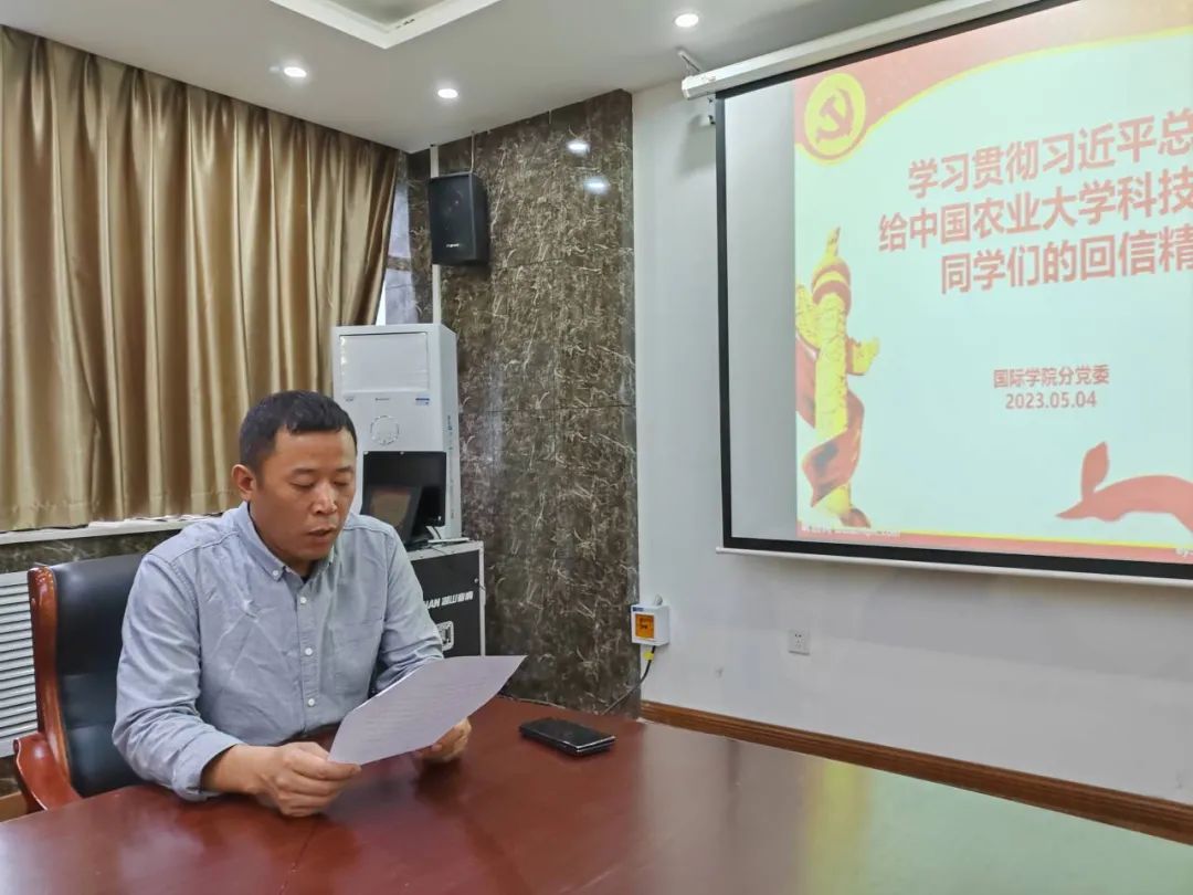5月4日上午,国际学院分党委召开党委扩大会议学习贯彻习近平总书记给中国农业大学科技小院的同学们的回信精神,分党委委员及各支部委员参会,会议由分党委书记刘景涛同志主持。