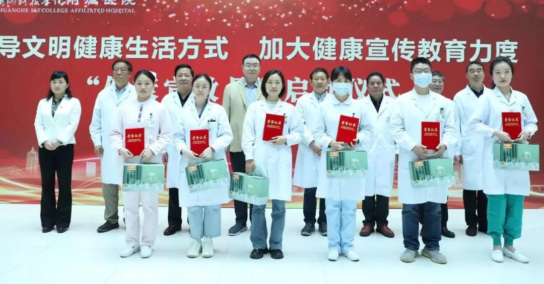 启动仪式上,附属医院2022年度健康宣传教育工作先进个人受到集体表彰。手术麻醉科麻醉师李亚琼、耳鼻喉科医师王云、妇产科护师刘雨、检验科技师焦晓楠、心内科医师刘群保、预防接种门诊护师王安娜在2022年的健康宣教活动中表现突出,获评“2022年度健康宣传教育工作先进个人”,其中刘雨代表获奖人员发言。院领导为获奖人员颁奖,与获奖人员合影留念。